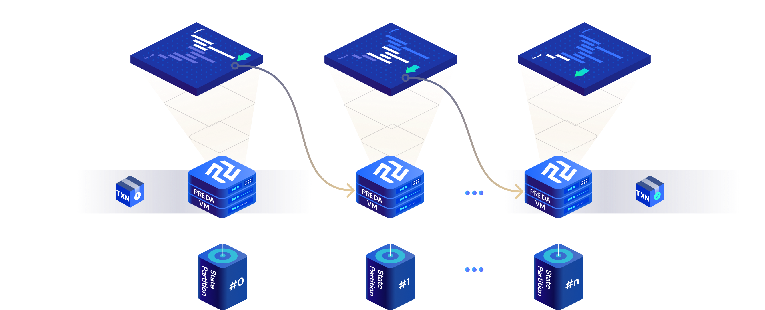 In a multi-chain system, each sequential state machine (a chain) operates independently, and jointly forms a parallel computing system with message-passing (relay transactions) for inter-thread coordination. PREDA model leverages existing parallelism of the multi-chain system by distributing ledger states and transactions across these chains.